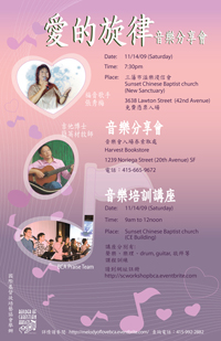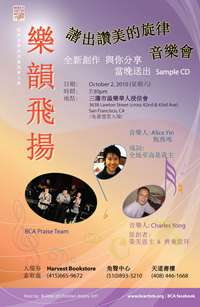 In continuation of the calling for BCA to encourage and building up our church through Christian music. We acknowledge the great needs in lack of original Chinese Christian songs and music. BCA hosted a special concert “樂韻飛揚‧譜出讚美的旋律 “ on October 2, 2010 (Saturday).